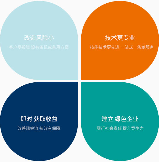 基于对己方投入的高效设备与节能技术的充分认识与信任,节能服务公司可以向用户承诺节能量,保证用户在完成交钥匙工程后,可以马上实现能源成本的下降。